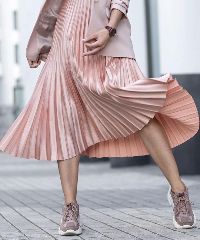 それらが出会った『くすみピンク ロングプリーツスカート』が、大人女性の春コーデをこなれ感たっぷりに演出します。